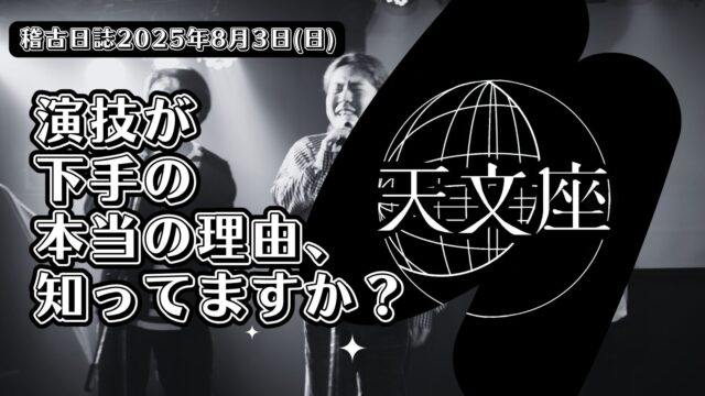 稽古日誌 「演技が下手」の本当の理由、知ってますか? 8月 4, 2025 tenmonza https://tenmonza.jp/wp-content/uploads/2020/09/Page-1-quality100-1.jpg 劇団天文座