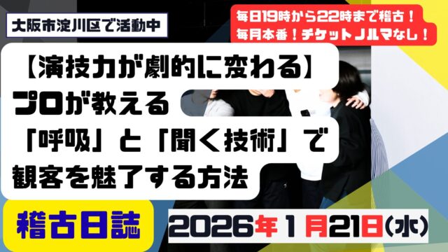稽古日誌 【演技力が劇的に変わる】プロが教える「呼吸」と「聞く技術」で観客を魅了する方法 1月 22, 2026 tenmonza https://tenmonza.jp/wp-content/uploads/2020/09/Page-1-quality100-1.jpg 劇団天文座