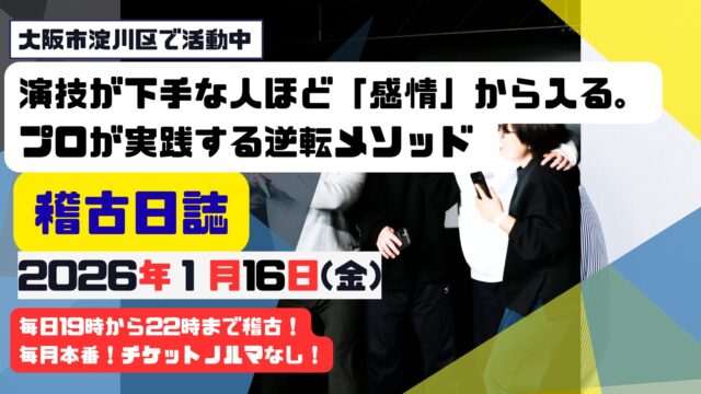 稽古日誌 演技が下手な人ほど「感情」から入る。プロが実践する逆転メソッド 1月 17, 2026 tenmonza https://tenmonza.jp/wp-content/uploads/2020/09/Page-1-quality100-1.jpg 劇団天文座