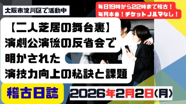 稽古日誌 【二人芝居の舞台裏】演劇公演後の反省会で明かされた演技力向上の秘訣と課題 2月 3, 2026 tenmonza https://tenmonza.jp/wp-content/uploads/2020/09/Page-1-quality100-1.jpg 劇団天文座
